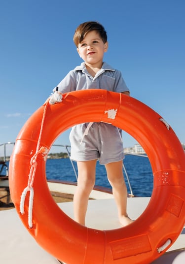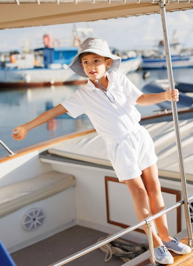 A refined children’s editorial photographed in Sicily. Minimal silhouettes, soft summer light and nautical details come together to capture a calm and elegant vision of childhood, inspired by freedom, balance and life near the water.